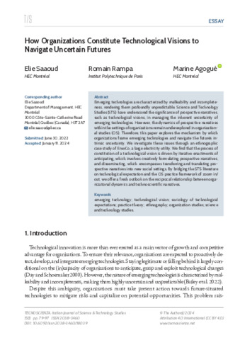 Emerging technologies are characterized by malleability and incompleteness, rendering them profoundly unpredictable. Science and Technology Studies (STS) have underscored the significance of prospective narratives, such as technological visions, in managing the inherent uncertainty of emerging technologies. However, the dynamics of prospective narratives within the settings of organizations remain underexplored in organizational studies (OS). Therefore, this paper explores the mechanism by which organizations frame emerging technologies and navigate the future’s intrinsic uncertainty. We investigate these issues through an ethnographic case study of EnerCo, a large electricity utility. We find that the process of constitution of a technological vision is driven by iterative enactments of anticipating, which involves creatively formulating prospective narratives, and disseminating, which encompasses transferring and translating prospective narratives into new social settings. By bridging the STS literature on technological expectation and the OS practice framework of zoom in/out, we offer a fresh outlook on the reciprocal relationship between organizational dynamics and technoscientific narratives.