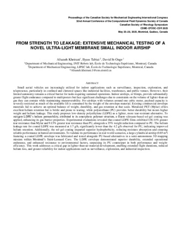 Kheirani, Afsaneh, Tabiai, Ilyass et St-Onge, David. 2025. « From strength to leakage: Extensive mechanical testing of a novel ultra-light membrane small indoor airship ». Communication lors de la conférence : CSME-CFDSC-CSR 2025 International Congress (Montreal, QC, Canada, May 25-28, 2025).