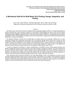 Catar, Louis, Rojas, Sebastian Zagal, Wadoux, Pierre, Tabiai, Ilyass et St-Onge, David. 2025. « A mechanical add-on for multi-resin SLA printing: Design, integration, and testing ». Communication lors de la conférence : CSME-CFDSC-CSR 2025 International Congress (Montreal, QC, Canada, May 25-28, 2025).